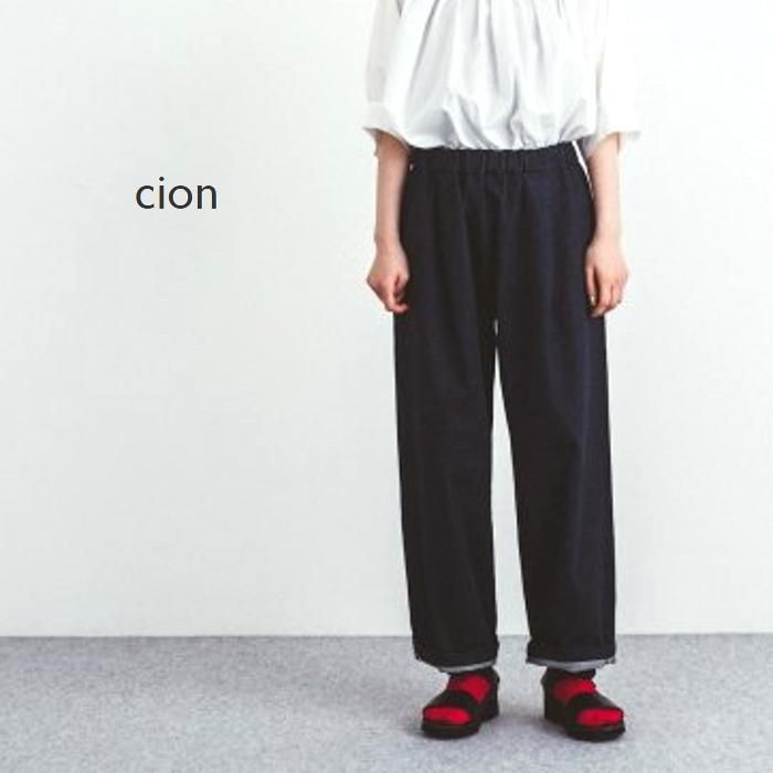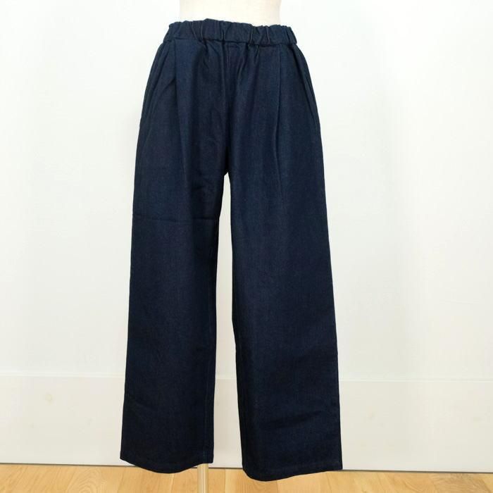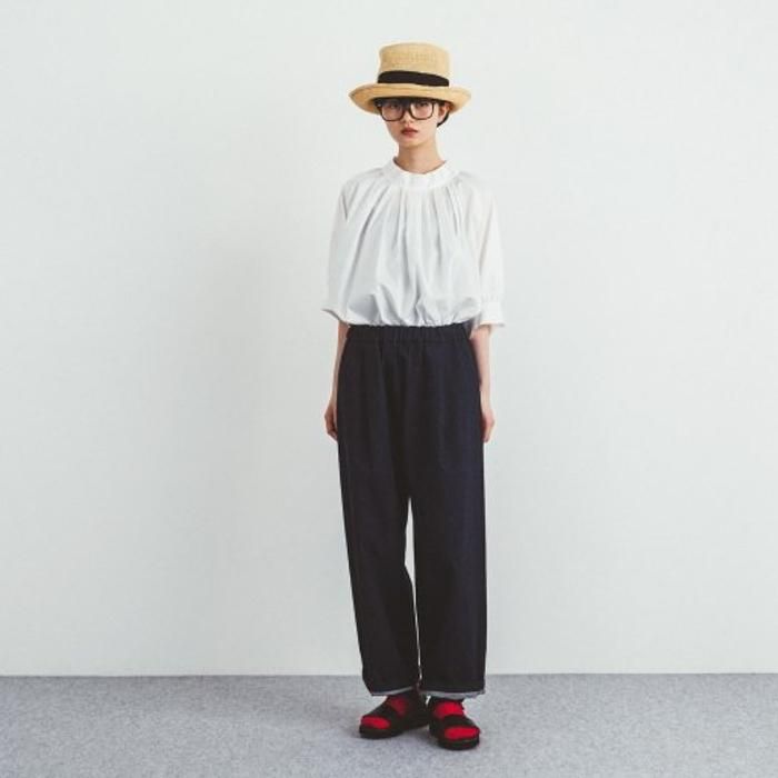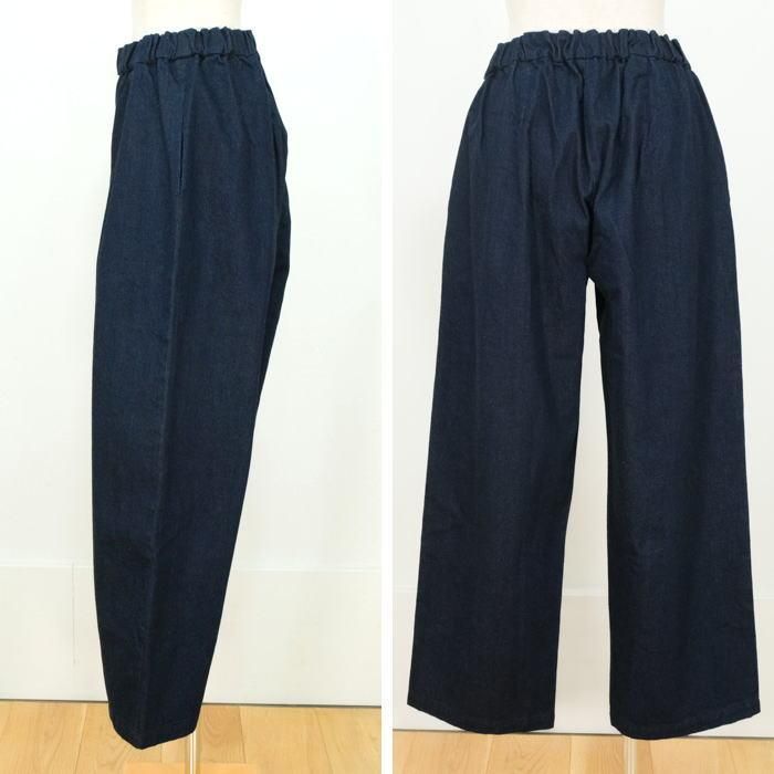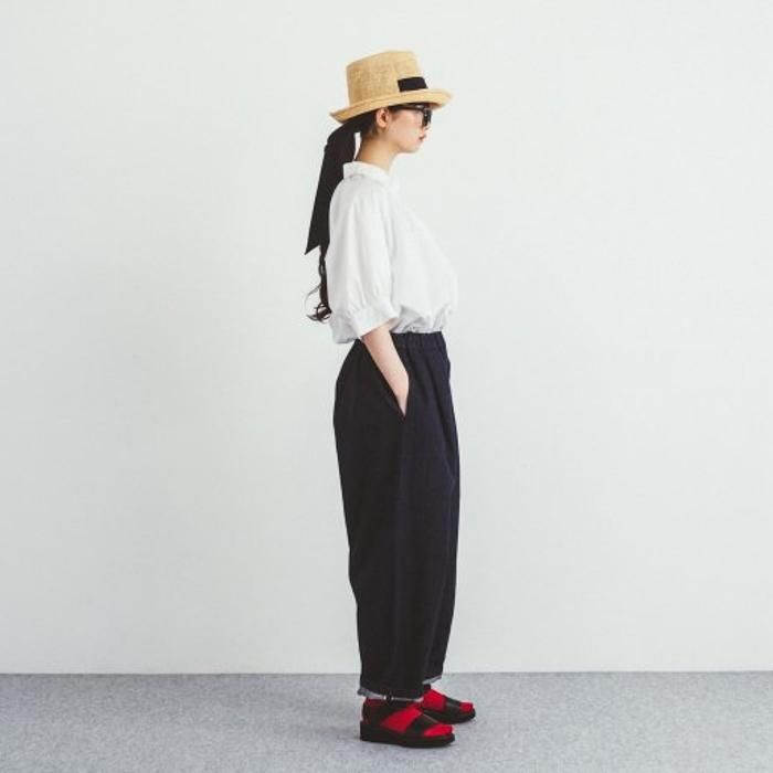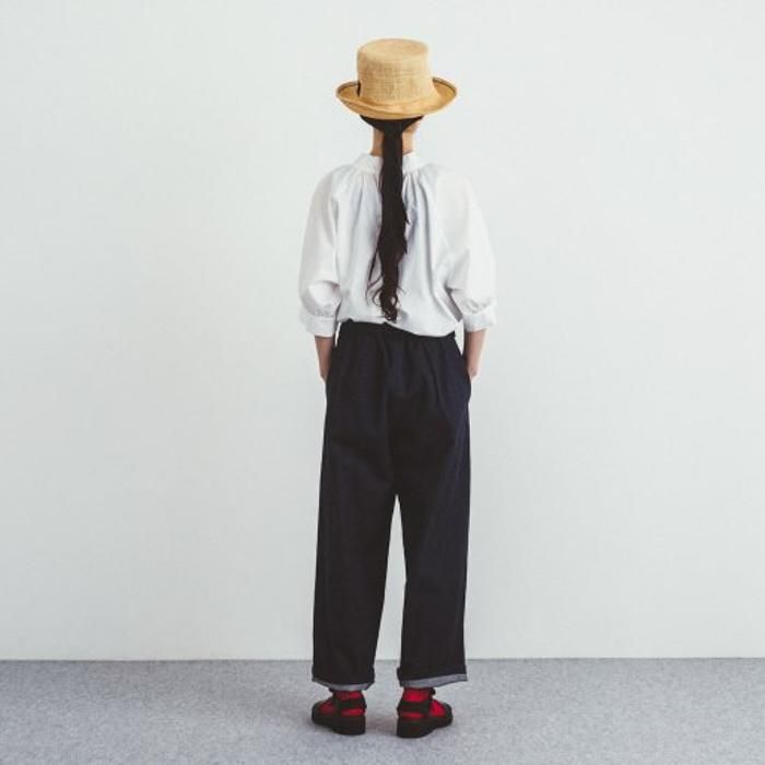 フロントに入れた深めのタックでウエストまわりにゆとりを出し、